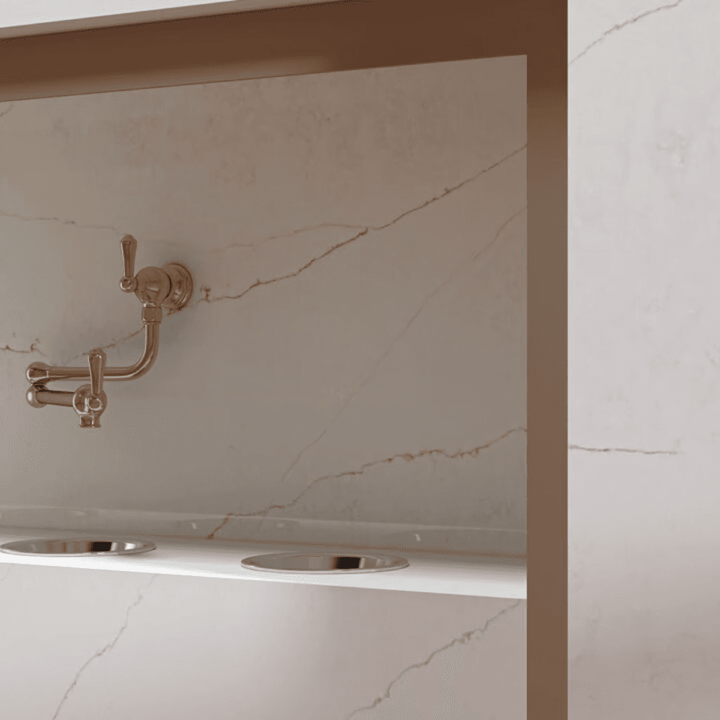 Calacatta Oro features a creamy base with elegant gold veining. It offers a more classic marble feel while still giving off Taj vibes—easy to maintain and easy to love.