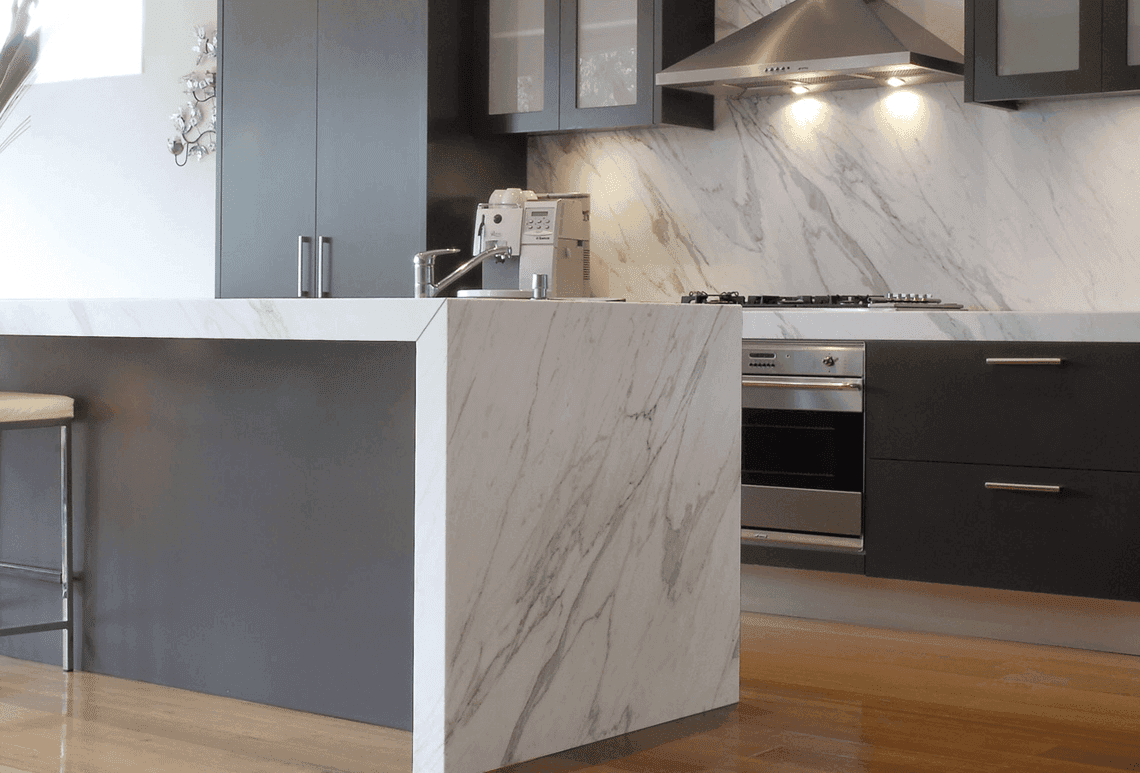 Calacatta-style quartz with bold veining